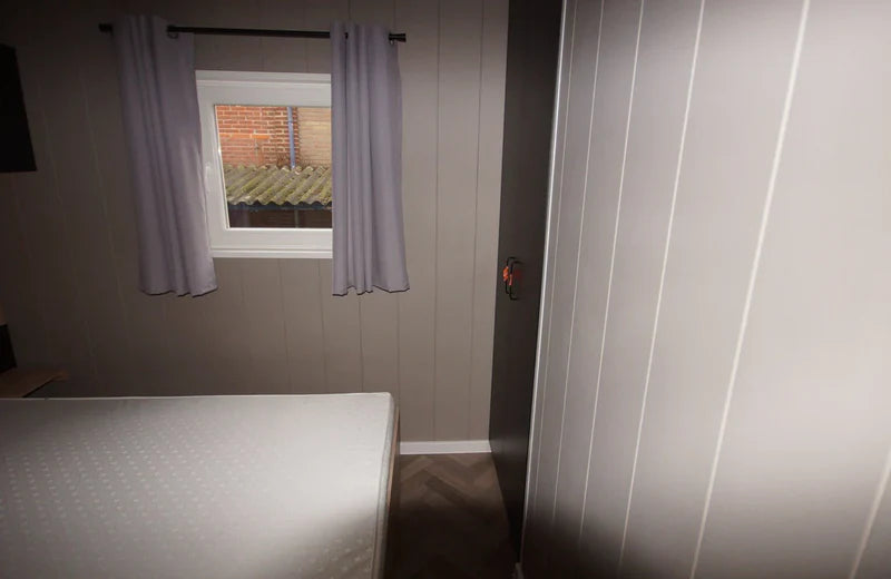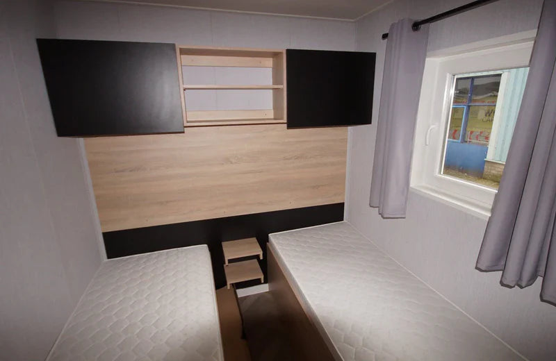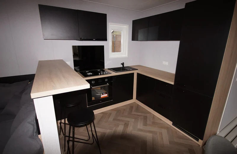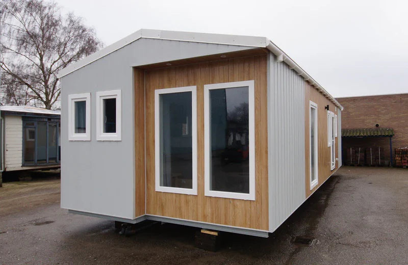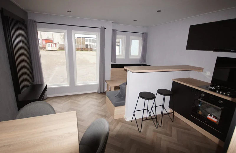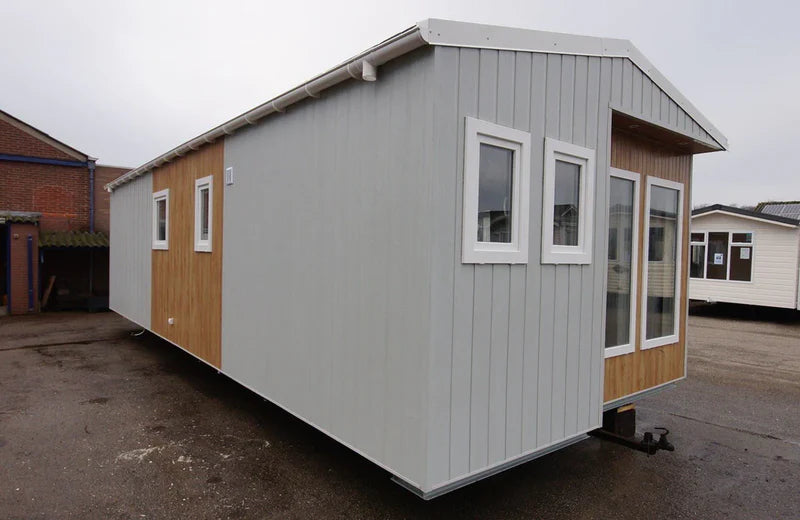 Contenedor móvil nuevo con revestimiento exterior de plástico, calefacción por suelo radiante, cocina de lujo, doble acristalamiento y techo de tejas.
