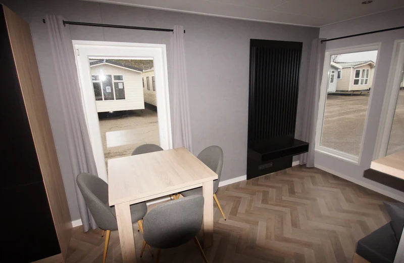 Cómoda sala de estar con sofá de esquina y mesa de café, ventanas panorámicas, comedor con 4 sillas y ventana francesa. También hay un gran armario de almacenamiento con puerta doble.