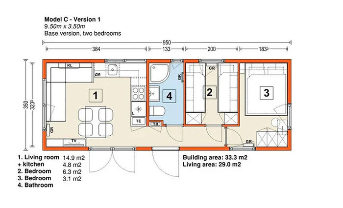 Modelo C – casa móvil sobre ruedas.  Nuestra propuesta es una casa móvil de tamaño medio con una superficie construida de 33 m² a 37 m². Se trata de un chalé práctico y funcional con un estilo moderno, mantenido en una paleta de colores vivos y limpios, a una escala y un precio razonables. Hay diez opciones de diseño interior disponibles. El aspecto exterior – combinación de colores, elección de materiales de acabado y colocación de ventanas – puede adaptarse a los requisitos específicos del cliente. La casa es rectangular, con un tejado inclinado 12 grados.