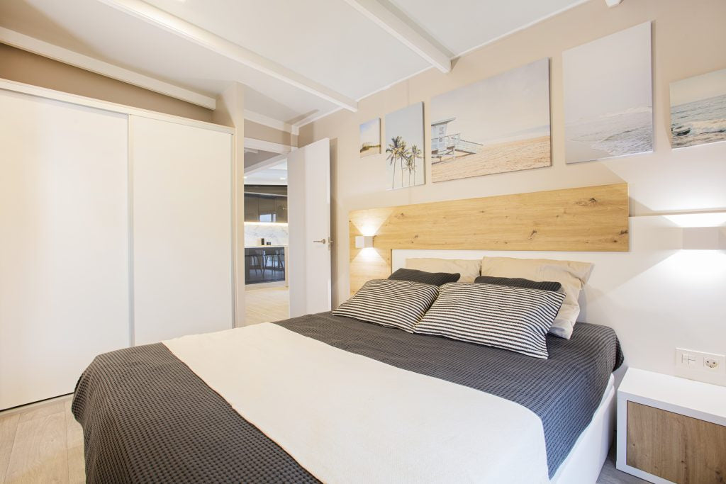 lectura, con escritorio. Cama del dormitorio principal con canapé con cabezal y luces de lectura.