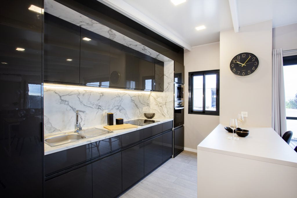 • Galería y lavandería independiente oculta tras la cocina, con ventana y puerta abatible de aluminio y vidrio