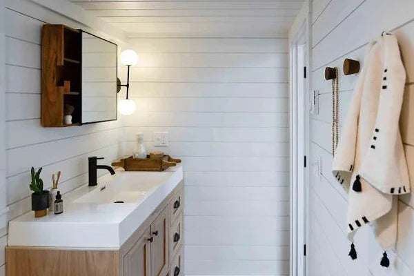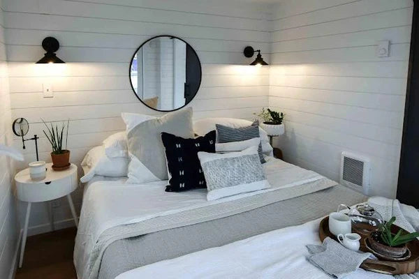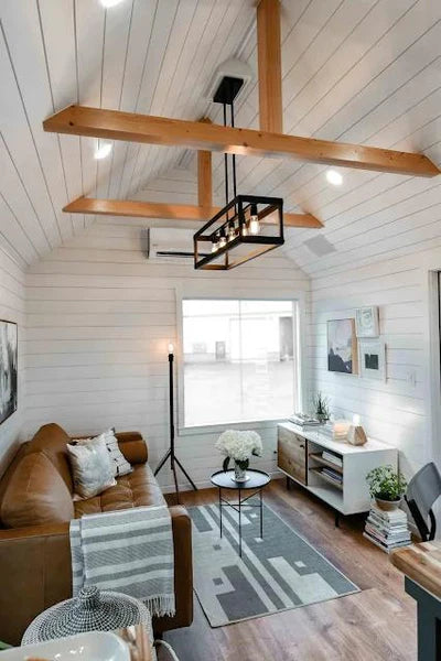 El interior de la casa móvil Vital presenta superficies de paredes de pino pintadas de blanco, creando una atmósfera limpia y luminosa. Los detalles de madera natural, como puertas de granero, cierres de collar y estantes abiertos, añaden un toque de calidez al espacio. El baño cuenta con un tocador, mientras que la mesa de comedor opcional muestra la belleza de la madera de nogal. El exterior de la casa es una mezcla de tablillas y revestimiento de tablas traslapadas, complementado con collares de cedro y rieles en T. Las ventanas de bronce templado aprovechan al máximo el espacio. Ventanas de bronce y templado permiten la entrada de luz natural a los espacios.